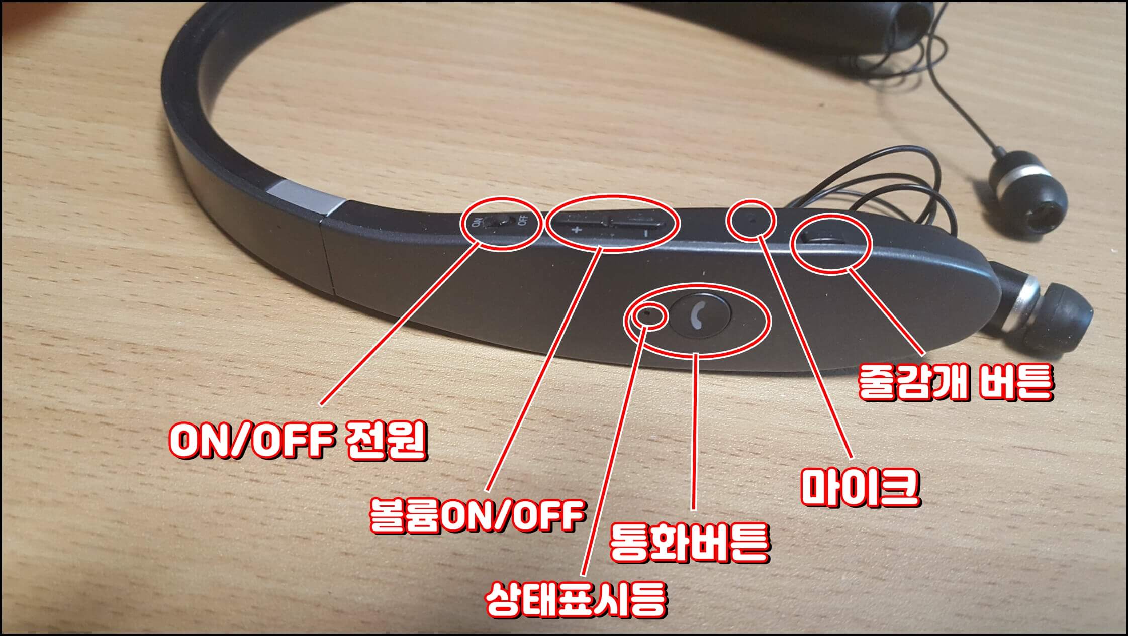 키 구성은 간단합니다 ON/OFF / 볼륨+,-/ 통화버튼 / 상태 표시등 / 마이크 / 줄감개 버튼의 구성으로 되어 있습니다.