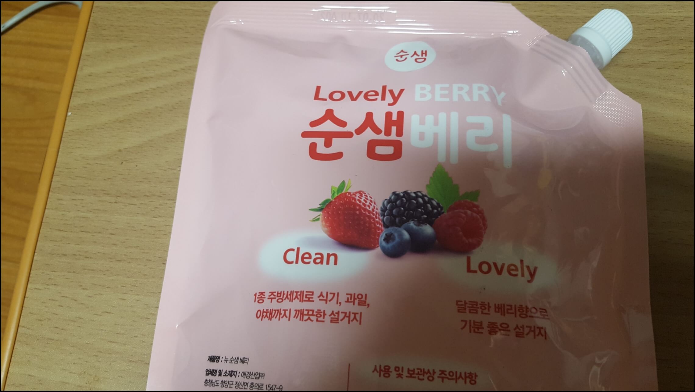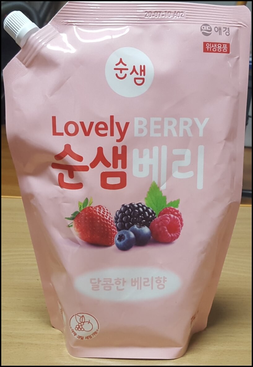 애경에서 개발 생산하고 있는 순샘 베리는 설거지뿐만 아니라 야채와 과일을 세척할 수 있는 용도로 제작되었습니다. 겉 포장이 분홍색이어서 그런지 포장지에 있는 이미지와 색깔 상품명의 조화가 굉장히 좋은 것 같습니다.