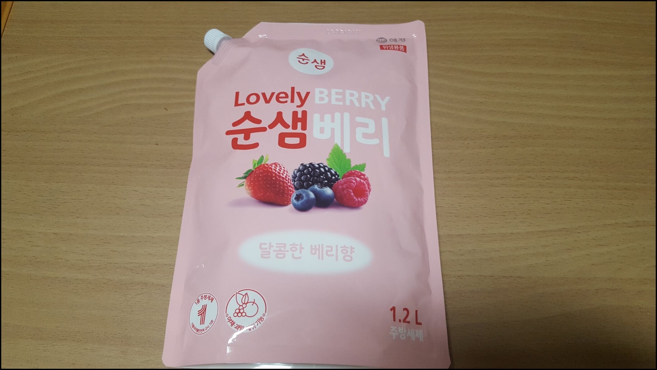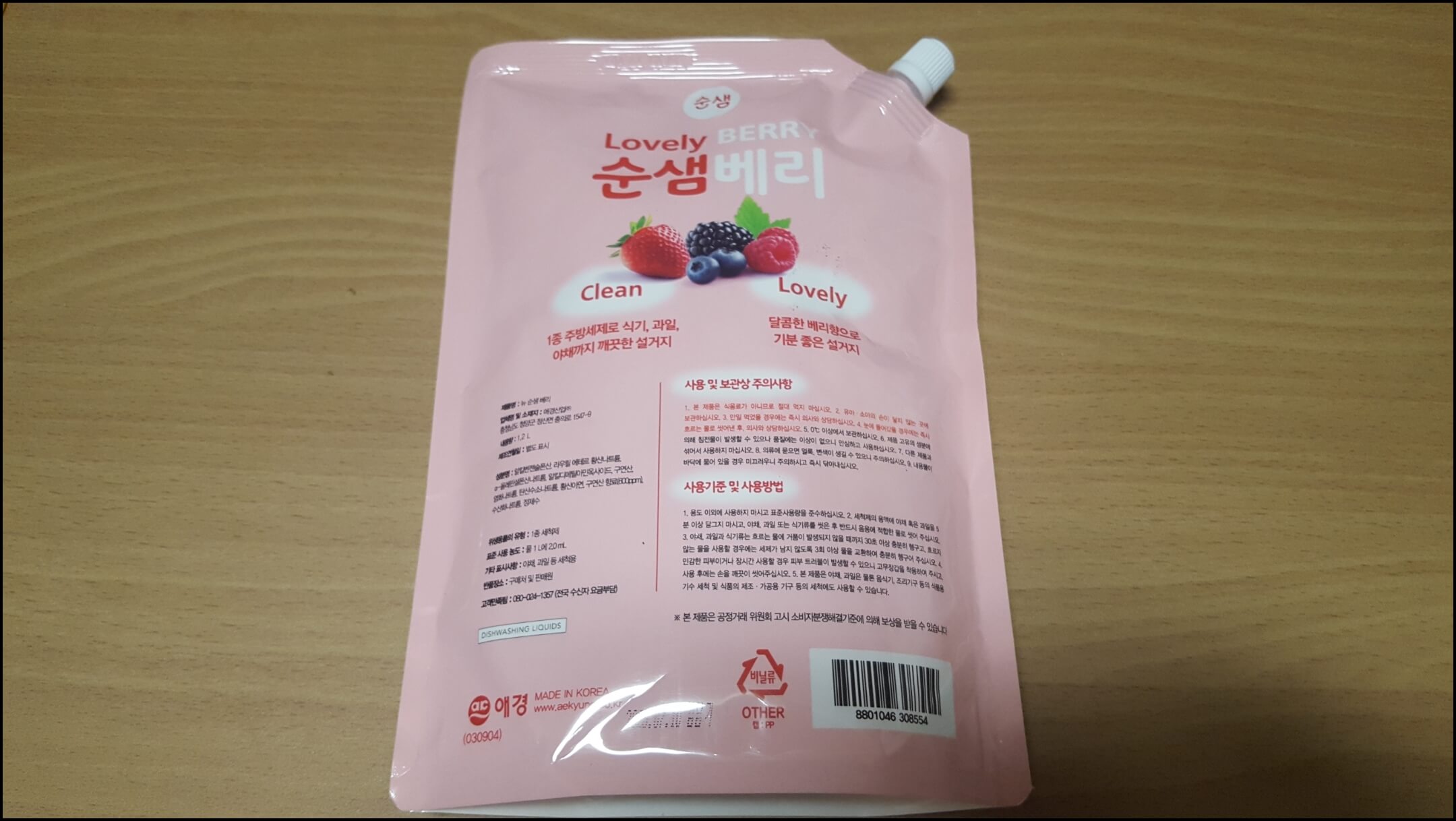애경에서 개발 생산하고 있는 순샘 베리는 설거지뿐만 아니라 야채와 과일을 세척할 수 있는 용도로 제작되었습니다. 겉 포장이 분홍색이어서 그런지 포장지에 있는 이미지와 색깔 상품명의 조화가 굉장히 좋은 것 같습니다.