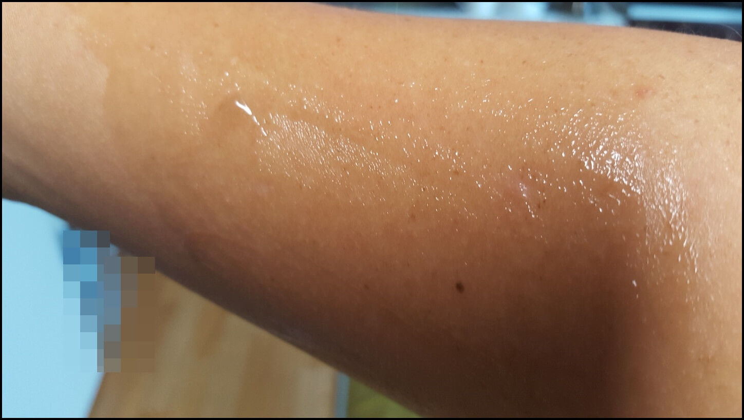 크림을 손바닥에 짜 봤습니다. 색깔은 갈색인데 느낌이 굉장히 부드럽습니다. 일단 손바닥에 짜기만 하고 바르지 않았기 때문에 청량감은 아직 없습니다. 그럼 각 부위에 발라보도록 할 텐데요.. 직립 보행하는 인간이 대표적으로 아픈 부위는 어깨와 허리 팔다리 근육이겠죠.. 저는 팔뚝과 허벅지에 발라보도록 하겠습니다.