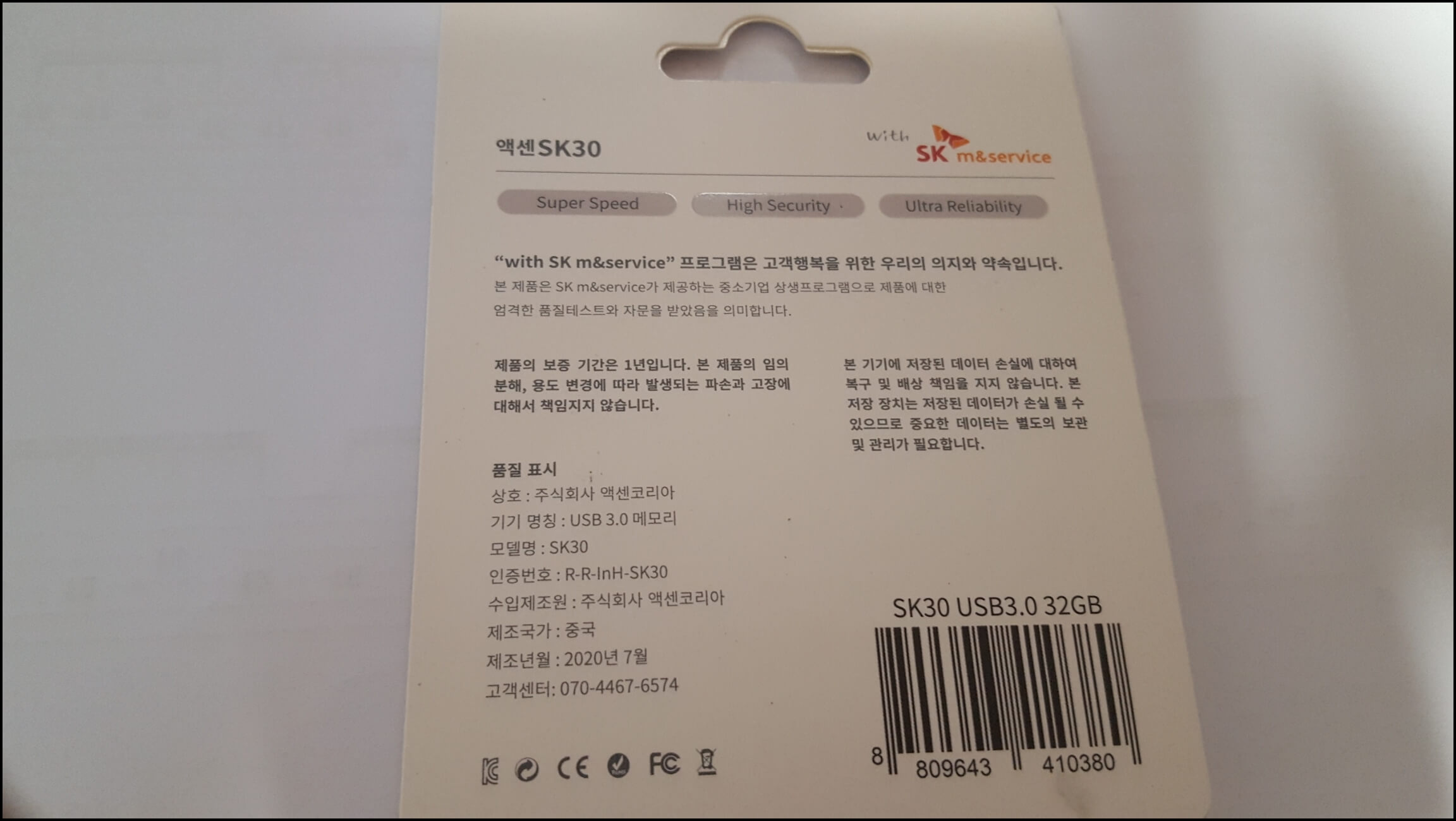 후기 서문에서는 SK m&service 마크의 의미는 대기업이 중소기업과의 상생을 위해 엄격한 품질 테스트와 자문을 얻어서 만든 제품을 의미한다고 합니다. 그래서인지 Super speed, high Security, Ultra Reliability 이 3가지를 강조하고 있습니다.