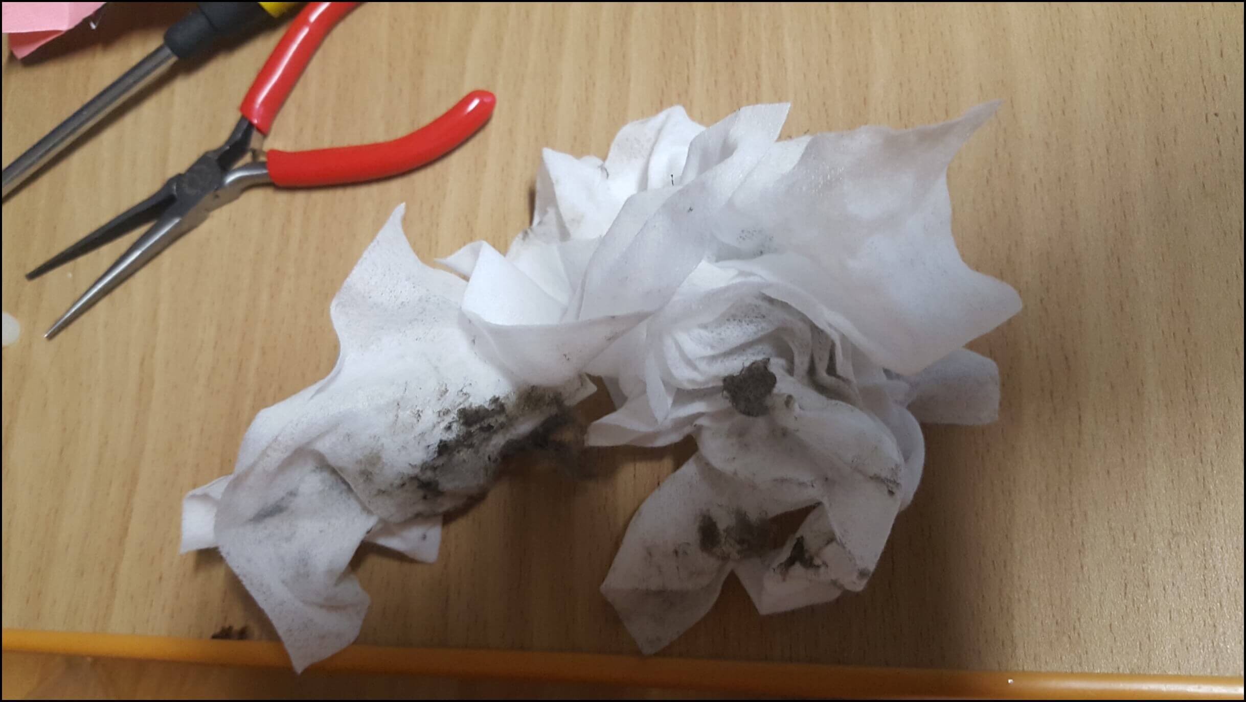 앞쪽에도 먼지가 많이 묻었습니다. 모터는 물로 세척할 수 없으니 물티슈로 닦아 보도록 하겠습니다.