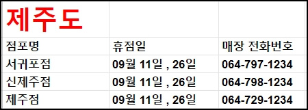 제주시는 서귀포점, 신제주점, 제주점이 있으며 11일, 26일 날이 쉬는 날입니다.