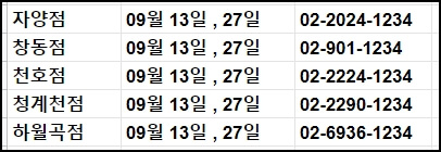 강원도는 강릉점, 동해점, 속초점, 원주점, 춘천점, 태백점 등이 있네요. 이 중에서 강릉, 원주, 태백점이 9일과 13일이 휴일입니다.