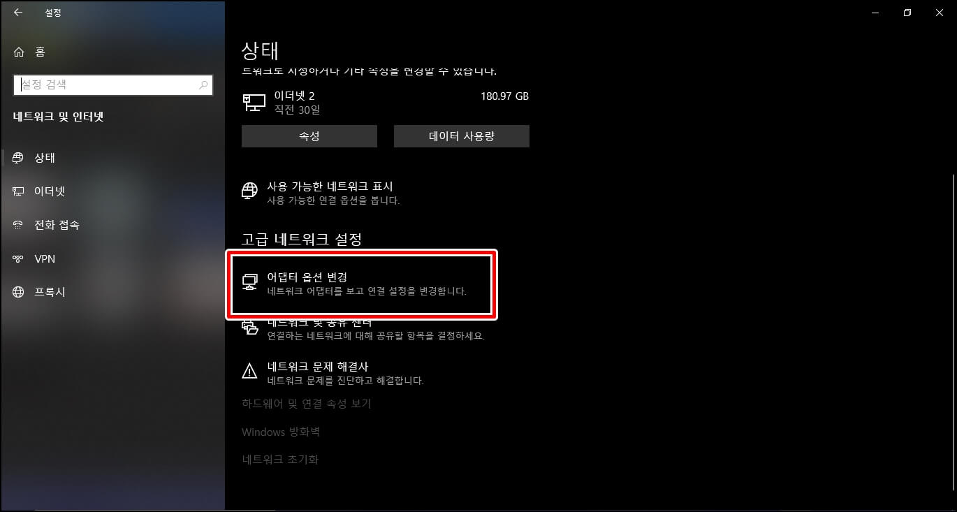 네트워크 설정 변경에 접속하셨다면 [어댑터 옵션 변경]을 클릭합니다.