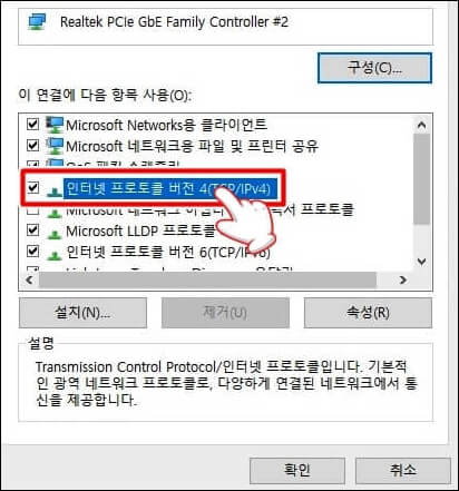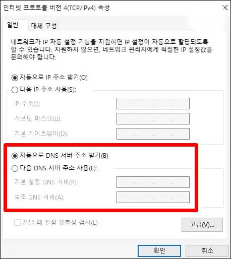 속성에서 인터넷 프로토콜 버전 4(TCP/IPTV4)