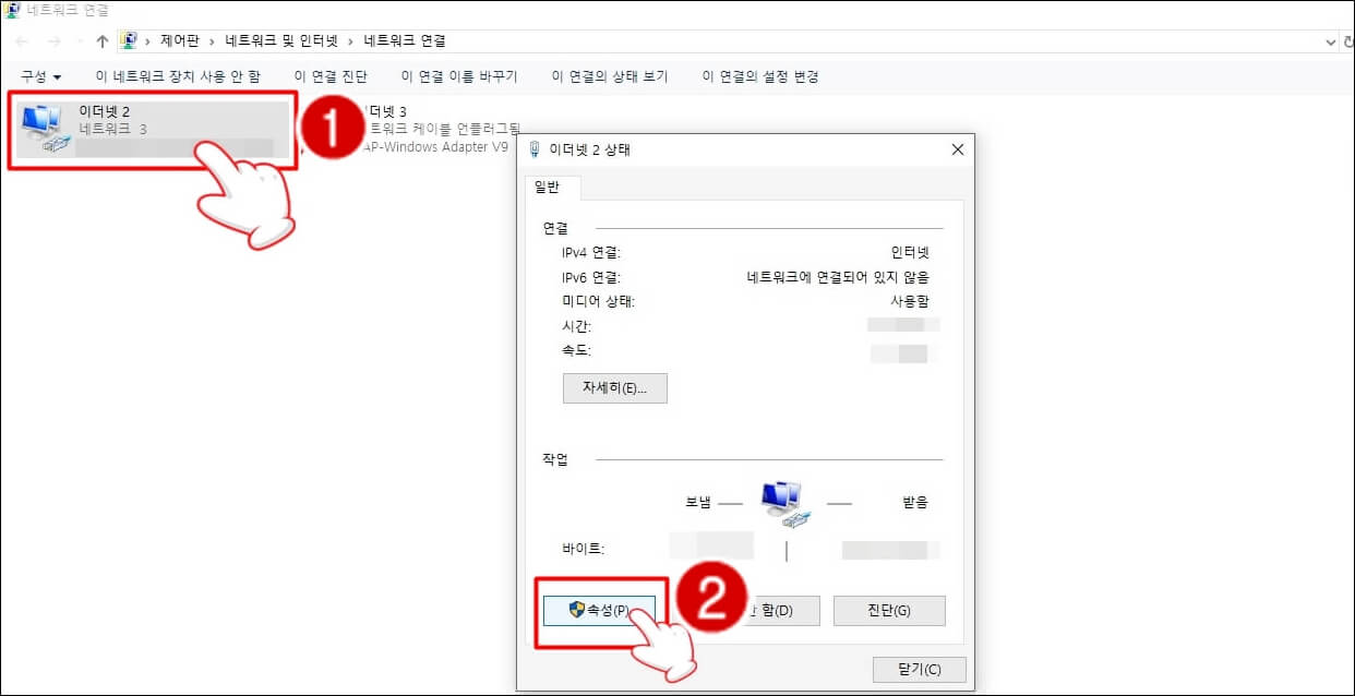 이더넷 2를 클릭하시고 이더넷 2 상태 탭에서 [속성]을 클릭합니다.