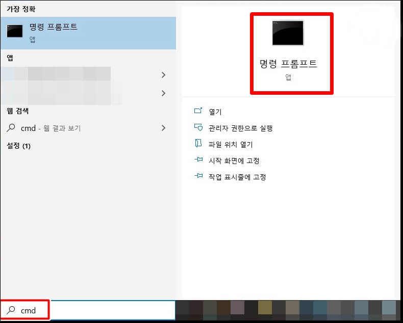 자 그럼 DNS 주소를 변경했으니 이번에는 CMD 명령 프롬프트를 이용하여 캐시를 삭제해 보도록 하겠습니다. 캐시 삭제의 정의는 DNS를 변경하였으니 이전에 남았던 먼지나 찌꺼기를 청소하는 개념으로 보시면 될 것 같네요. 좌측 하단에 에 cmd를 입력하시고 명령 프롬프트를 [관리자 권한으로 실행]합니다.