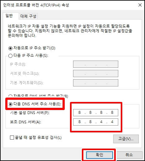 기본 설정 DNS 서버와 보조 DNS 서버에 각각 8. 8. 8. 8 / 8. 8. 4. 4를 입력해 주신 다음 확인을 클릭합니다. 해당 DNS 서버 주소는 구글 DNS 주소로 컴퓨터를 사용하실 때 구글의 크롬을 자주 이용하신다면 DNS를 구글의 DNS 변경을 하면 좀 더 빠르고 쾌적하게 웹서핑을 즐기실 수 있습니다.