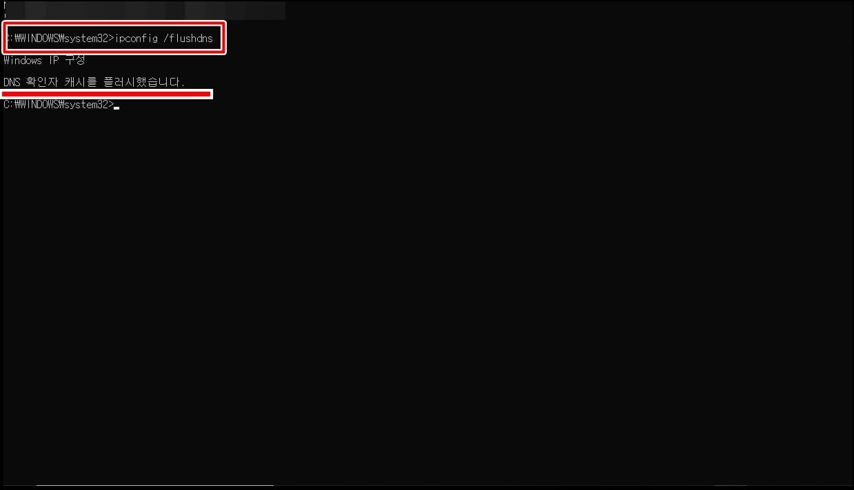 그리고 명령 창에 ipconfig /flushdhs를 입력하시고 엔터키를 누르시면 아래와 같이 [DNS 확인자 캐시를 플러시 했습니다.]라는 문구가 나오는데요. 이 문구가 떴다면 이전에 남아있던 모든 찌꺼기가 제거된 것입니다. 여기까지 하시면 모든 설정이 끝이 납니다.