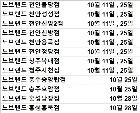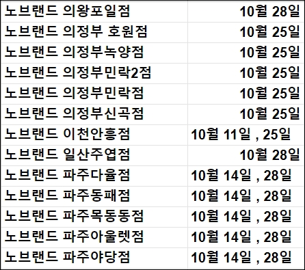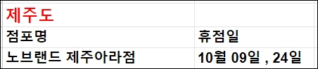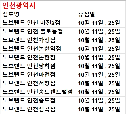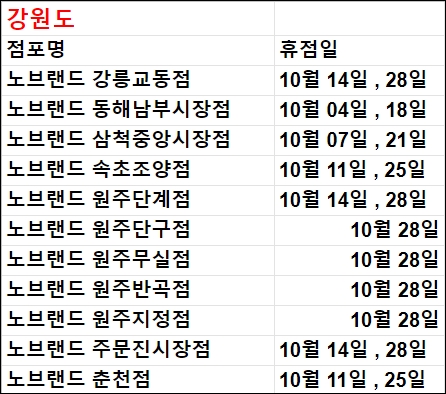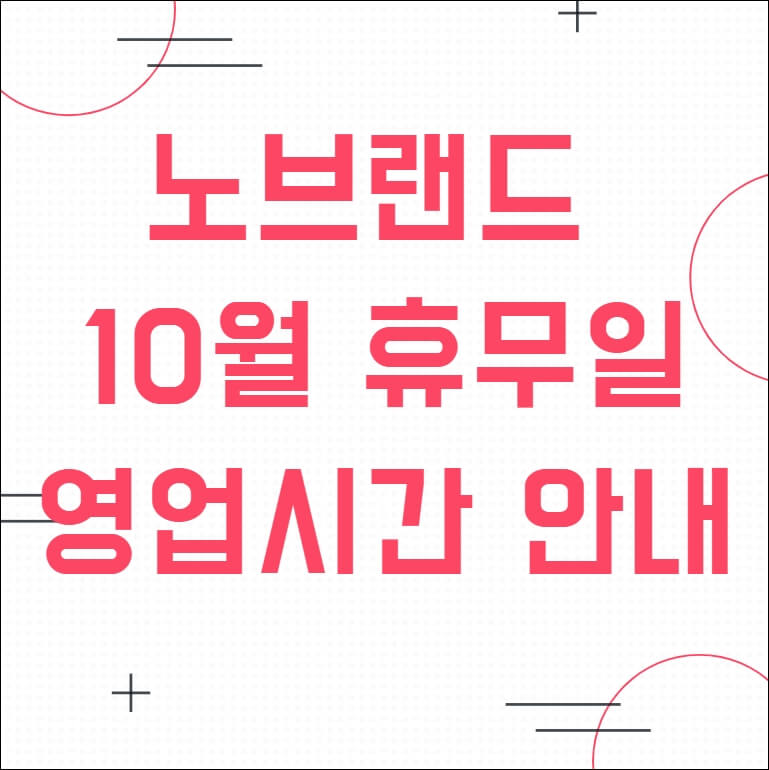 신나는 주말! 쇼핑을 가기 전에 반드시 가기 전에 해당 영업점의 휴무일과 영업시간을 꼭 체크하시고 가야 합니다. 확인을 하지 않고 갔다가 해당 영업점이 쉬는 날이면 모처럼 기분 좋은 휴일에 기분이 확 상할 수가 있으니 출발하시기 전에 반드시 체크하시고 가시는 것을 추천드립니다. 그럼 10월에 전국 노브랜드의 휴무일이 어떻게 되는지 알아보도록 하겠습니다. 출발!!