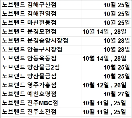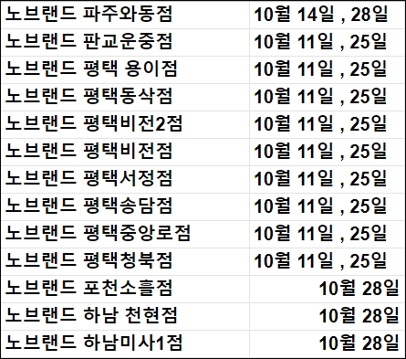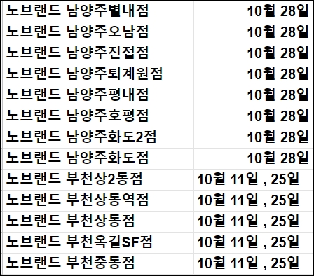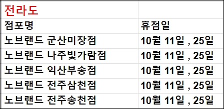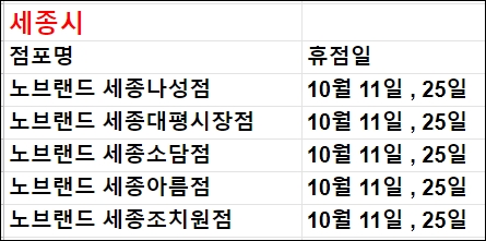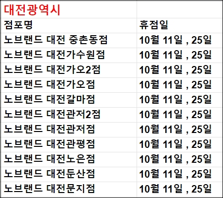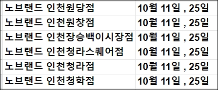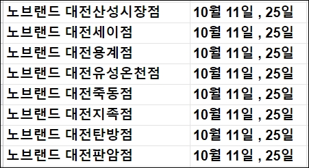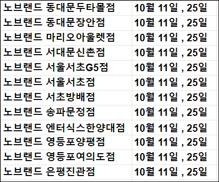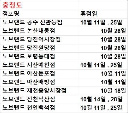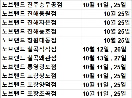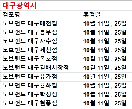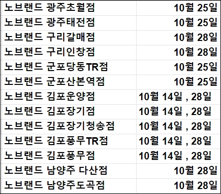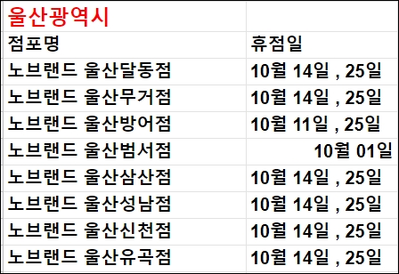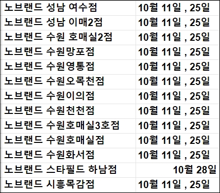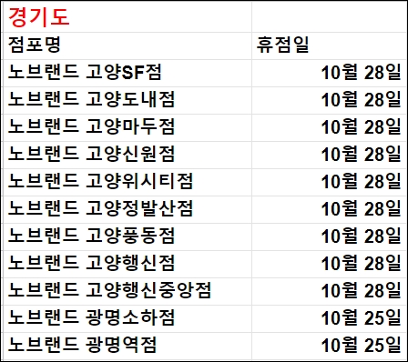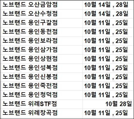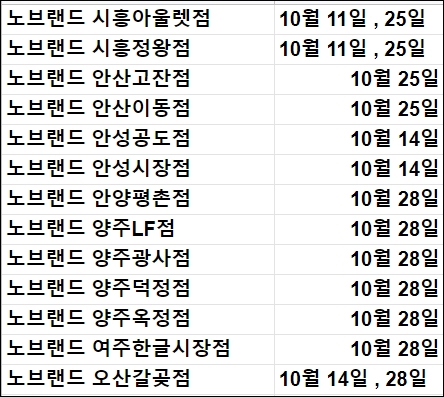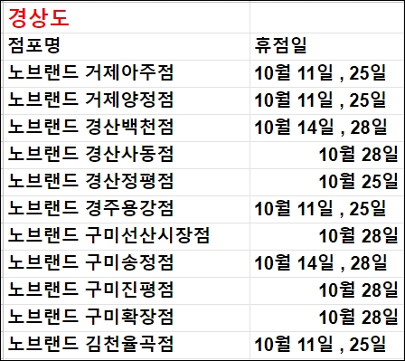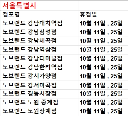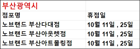 신나는 주말! 쇼핑을 가기 전에 반드시 가기 전에 해당 영업점의 휴무일과 영업시간을 꼭 체크하시고 가야 합니다. 확인을 하지 않고 갔다가 해당 영업점이 쉬는 날이면 모처럼 기분 좋은 휴일에 기분이 확 상할 수가 있으니 출발하시기 전에 반드시 체크하시고 가시는 것을 추천드립니다. 그럼 10월에 전국 노브랜드의 휴무일이 어떻게 되는지 알아보도록 하겠습니다. 출발!!