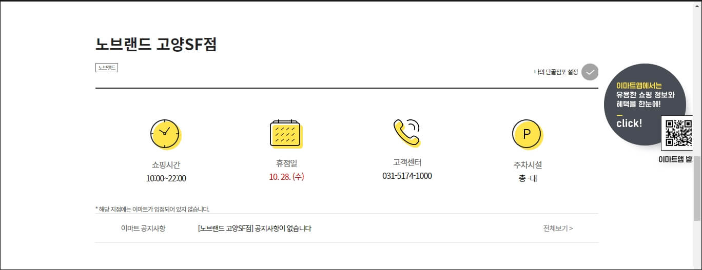 그럼 아래와 같이 쇼핑시간, 휴점일, 고객센터, 주차시설 등의 정보를 확인하실 수 있습니다.