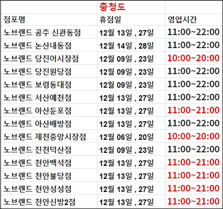 공주 신관동점 논산 내동점 당진어 시장점 당진 원당점 보령 동대점 서산 예천점 아산 둔포점 아산 배방점 제천 중앙시장점 진천 덕산점 천안 백석점 천안 불당점 천안 성성점 천안 신방 2점 천안 신방점 천안 용곡점 천안 청당점 청주 복대점 청주 사천점 충주 중앙탑점 충주 호암점 홍성남 장점 홍성 홍북점