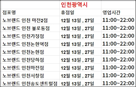 마전 2점 불로동점 가정점 논현역점 논현점 당하점 마전점 서창점 송도 센트럴점 송도점 심곡점 원당점 원창점 장승백이 시장점 청라점 청라 스퀘어점 청학점